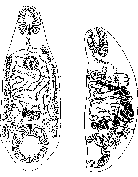 Ротовая присоска почти шаровидная (2—2.5 X 1.5—2 мм). Мышечная ее стенка почти равномерной толщины на всем своем протяжении (0.7 — 0.8); в задней части, где толщина ее достигает 0.3—0.4 мм, она снабжена дивертикулами.