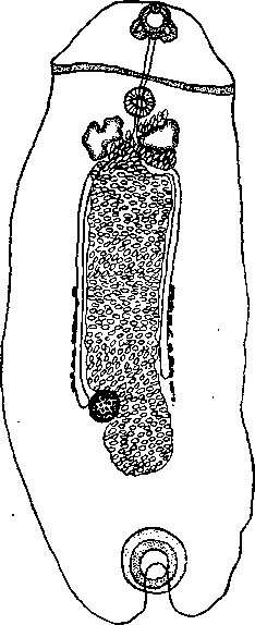 Половая бурса отсутствует. Семенной пузырек слабо развит. Семенники лопастные, 0.57 Х0.39 —0.44 мм в диаметре, располагаются по обе стороны заднего конца пищевода на одной горизонтальной линии кнаружи от начальных участков кишечника. Круглый яичник, 0.35—0.36 мм в диаметре, лежит йнтрацекально, на уровне заднего конца правого кишечного ствола.