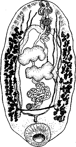 Отверстие половой клоаки расположено медианно на вентральной поверхности тела, на расстоянии 0.8 мм от ротового отверстия. Кутикула гладкая; экскреторное отверстие лежит медианно и дорзально сейчас же впереди задней присоски. Отверстие лаурерова канала расположено кпереду от экскреторного отверстия, дорзо-медианно. Маленькое терминальное ротовое отверстие, окруженное концентрическими складками кутикулы, ведет в ротовую присоску, которая обладает двумя латеральными мышечными дивертикулами. Они почти такого же размера, как присоска, и характеризуются одинаковым с ней мышечным строением.