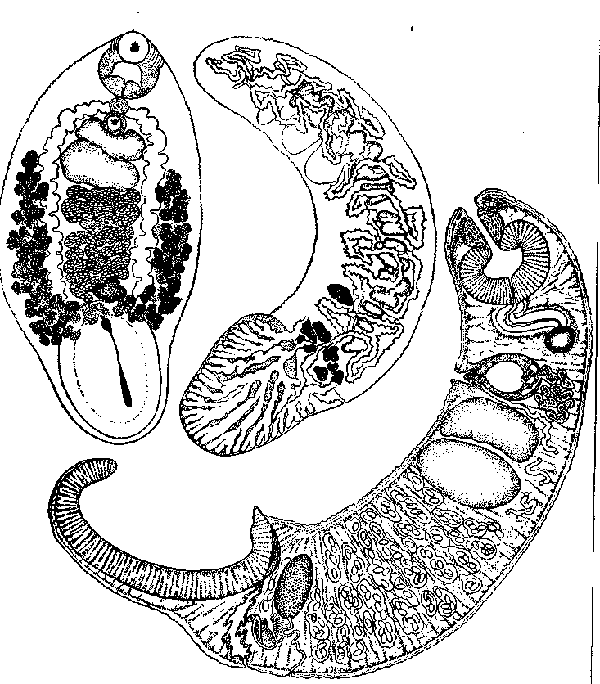 В задней половине пищевода кольцевая мускулатура значительно утолщается за счет просвета и состоит из десяти концентрических слоев волокон. У самого своего конца пищевод снова несколько суживается и разделяется на две довольно сильно мышечные ветви, которые переходят в кишечные стволы. Последние, сильно извиваясь, располагаются в области дорзальной поверхности тела, на середине расстояния между медианной линией тела и латеральными краями. Оканчиваются они близ переднего края брюшной присоски.