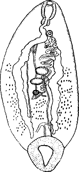 Отверстие брюшной присоски представляет собой щель длиной 1.4 мм, шириной 0.38 мм у переднего конца; щель эта суживается кзаду, заканчиваясь острым кончиком. Размер брюшной присоски 2—2.5x2 мм. Кутикула невооруженная, толщиной 0.010—0.012 мм. Она впячивается внутрь экскреторного и полового отверстий и выстилает пищеварительный тракт до бифуркации кишечника. Кутикулярно-мышечная стенка обладает хорошо развитыми круговыми, продольными и косыми слоями, причем внутри косого слоя существует еще дополнительный слой продольных волокон. Дорзо-вентральные волокна немногочисленны или отсутствуют; паренхима тела очень рыхлая и вакуолизированная.