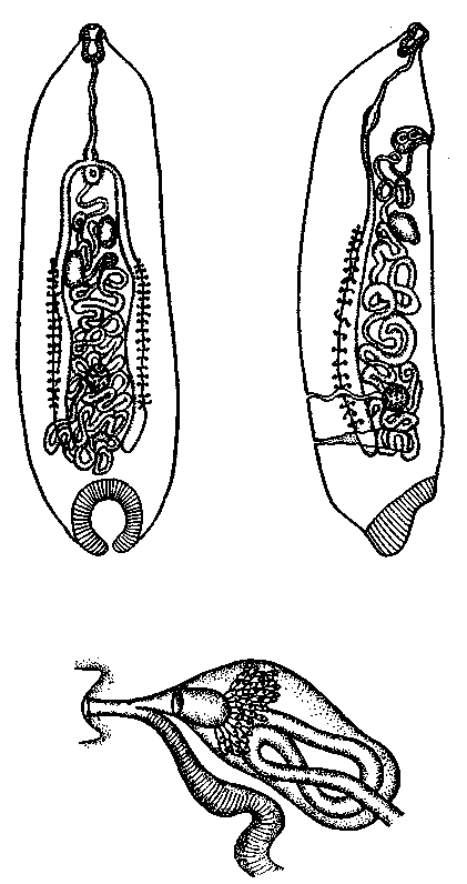 Затем переходит к задне-дорзальному направлению, постепенно утолщаясь и образуя на заднем конце мощный бульбус, 0.4—0.5 мм в диаметре, имеющий форму луковицы с небольшой перетяжкой посередине. Кишечные стволы, длиной 5.6—6 мм, расходятся от вентральной поверхности пищеводного бульбуса и направляются, несколько извиваясь, наружу и назад; они расположены довольно далеко от латеральных боков тела и оканчиваются впереди брюшной присоски.