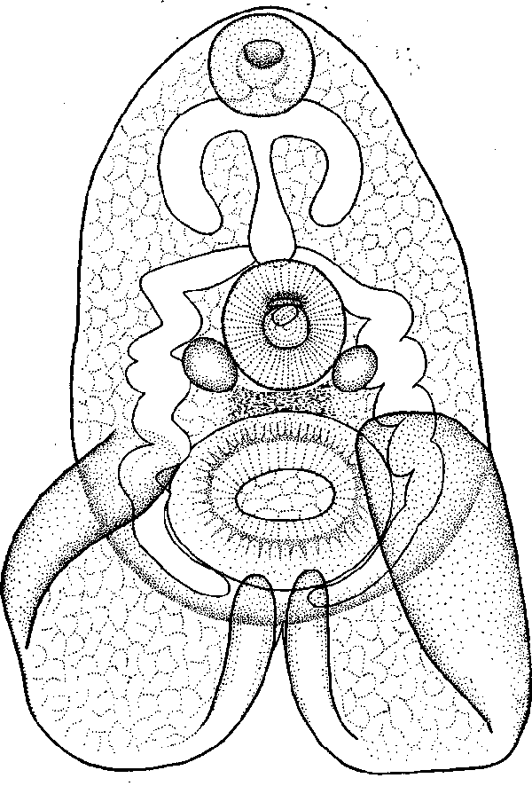 Круглый яичник лежит ближе к дорзальной поверхности, в промежутке между семенниками и слегка сбоку от медианной линии. Тельце Мелиса лежит медиально от яичника.