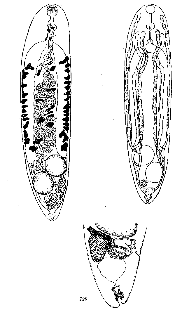 Впереди правого семенника матка описывает многочисленные поперечные петли между кишечными стволами; дойдя до бифуркации кишечника, она становится почти прямой и входит в половой синус вентрально от vas deferens. Яйца овальные, 0.077—-0.085x0.050—0.056 мм, светло-желтого цвета. Желточные фолликулы очень неправильной формы и различной величины, тянутся спереди назад, начинаясь несколько позади бифуркации кишечника и заканчиваясь слегка впереди задних концов кишечных стволов. Вокруг наружной половины каждого кишечного ствола желточники образуют группы, по 4—6 фолликулов в каждой, хорошо разграниченные между собой. В пространстве между кишечными стволами, на дорзальной стороне петель матки, таких групп относительно немного.