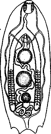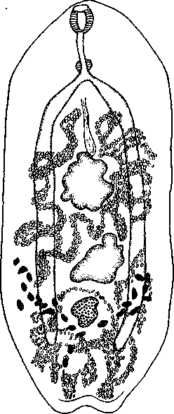 Экскреторный пузырь лежит медианно позади яичника, а экскреторное отверстие — на середине выемки, разделяющей два терминальных кончика тела.