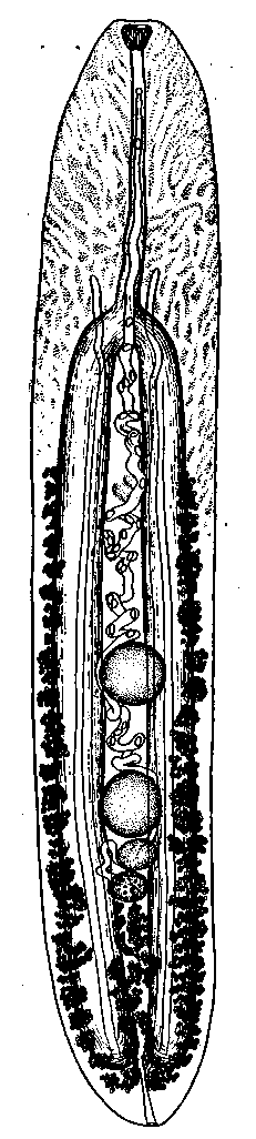 Кутикула гладкая. Задний конец тела несет длинный дорзальный отросток, заканчивающийся двумя сосочковидными латеральными образованиями с толстой мускулатурой; кроме того, на его медио-каудальной части располагается два маленьких сосочка. При исследовании заднего конца тела в вентральном положении видно, что с каждой стороны его располагается, по паре маленьких сосочков, объединенных в виде мышечного выступа. Ротовая присоска с 2 дивертикулами.