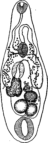 Семеприемник, 0.34—0.48x0.12—0.25 мм, располагается между яичником, передним семенником и стенкой тела. Имеется маленький лауреров канал. Желточники, состоящие из большого числа овальных фоликулов, начинаются от середины пищевода и переходят уровень задней границы кишечных стволов. Фолликулы желточников никогда не прикрывают кишечных стволов. Желточные протоки, как и у типичного вида. Матка ограничена пространством между семенниками и кишечными стволами; в редких случаях она может простираться до уровня задней границы заднего семенника. Яйца многочисленные, 0.076—0.087 мм длины и 0.041 — 0.049 мм ширины.