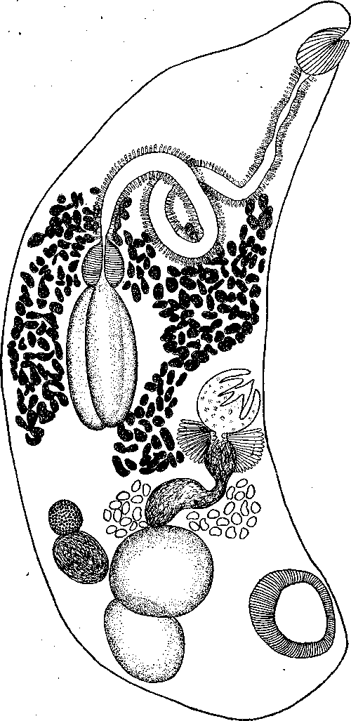 Своеобразный шаровидный половой синус, обладающий способностью выворачиваться, достигает 0.42—0.6 мм длины и 0.3—0.5 мм ширины; его отверстие окружено несколькими широкими хитиновыми выростами треугольной формы. Половое отверстие находится на уровне середины кишечных стволов. Маленький шарообразный яичник, 0.12—0.2 мм в диаметре, может занимать различные положения вблизи переднего семенника. Обычно он располагается впереди последнего, но может находиться сбоку от него или частично прикрывать его.