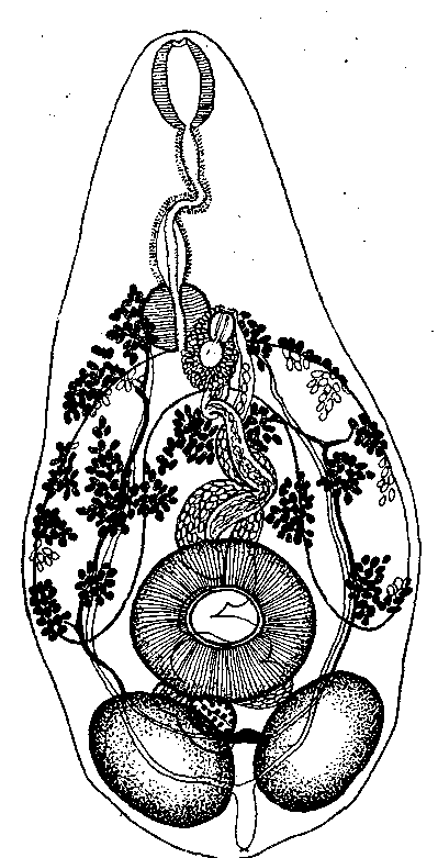 В месте перехода семенного пузырька в семеизвергательный канал располагается небольшая простатическая часть. Многочисленные простатические железы лежат в паренхиме тела, окружающей семеизвергательный канал. Половая бурса отсутствует. Маленький круглый или поперечно-овальный яичник располагается почти медианно, на некотором расстоянии кпереди от семенников. Слева от него лежит тельце Мелиса, от которого отходит кзади маленький грушевидный семеприемник, Лауреров канал имеется. Матка начинается от тельца Мелиса, заполняет пространство между семенником и задним концом семенного пузырька, затем направляется вперед, к половому отверстию, прилегая к семенному пузырьку справа.