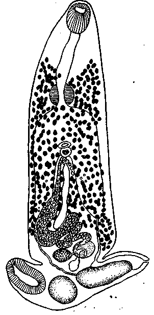 Желточники располагаются от заднего конца кишечных стволов до середины длины префаринкса, состоят из многочисленных мелких круглых фолликулов и занимают не только боковую зону паразита, но распределены также по дорзальной и вентральной сторонам тела. Яйца 0.065 мм длины и 0.039 мм ширины.