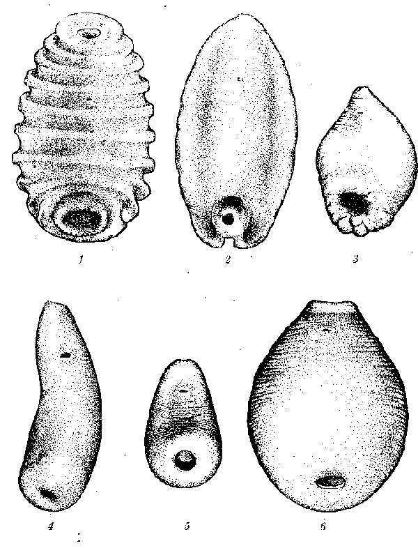 1. Nilocotyle paradoxus. 2. Nilocotyle polycladiformae. S. Calicophoron rajae. 4. Cotylophoron jacksoni. 5. Cotylophoron fulleborni. 6. Ugandocotyle pisum.