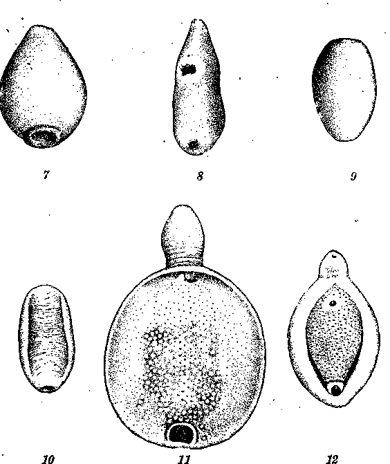 7. Nilocotyle pygmaeum. 8. Nilocotyle gigantoatrium. 9 и 10. Buxifrons maxima. 11. Gastrodiscus aegyptiacus. 12. Gaslrodiscus secundus.