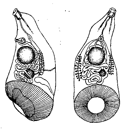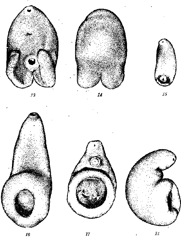 13 и 14. Brumptia hicaudata. 15. Diplodiscus subclavatus. 16. Gigantocotyle bathycotyle. 17. Gigantocolyle gigantocotyle. 18. Gigantocotyle symmeri