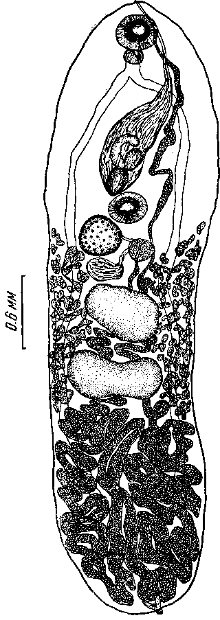 Довольно крупный овальный семеприемник, 0.11 х 0.127 мм, расположен постеро-дорзально от яичника; лауреров канал открывается дорзально, на уровне передней трети переднего семенника, на медианной линии. Петли матки идут кзади по левой стороне посттестикулярной зоны, достигают заднего конца тела, после чего возвращаются кпереду, идут по правой стороне этой зоны; проксимальная часть петель матки тянется вдоль терминальной части половой бурсы до полового отверстия, расположенного возле мужского полового отверстия. Желточники тянутся по бокам тела, в средней трети его длины. Фолликулы шаровидные или овальные, 0.022—0.036 х 0.024—0.047 мм. Яйца овальные, достигают в среднем 0.038 х0.016 мм.