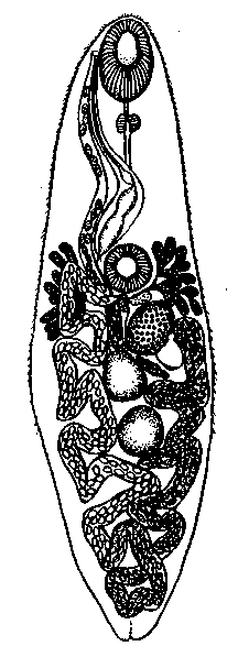 Семенники неправильно кругловатой формы, лежат сейчас же за брюшной присоской, почти медианно; между передним семенником и брюшной присоской, несколько сбоку, расположен яичник, превосходящий иногда своей величиной семенник; непосредственно позади брюшной присоски расположено медианно тельце Мелиса. Дорзально от яичника отходит кзади и наружу грушеобразный или бутылкообразный семеприемник с длинным стеблем, от основания которого отходит лауреров канал.