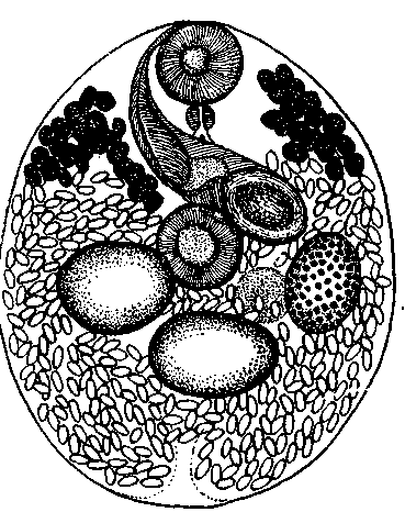 Яйца, 0.025 x 0.017 мм, не очень многочисленны; они имеют умеренно толстую скорлупу светлокоричневого цвета.