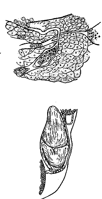 Тельце Мелиса хорошо выражено: лежит позади и слева от яичника. Семеприемник хорошо развит; лежит слегка влево от медианной линии, позади яичника.
