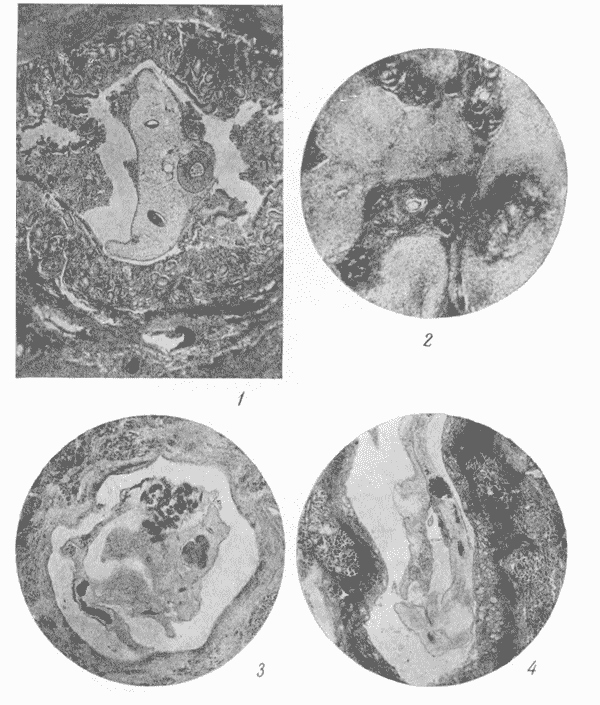 1 — локализация Opiathorchis felineus в желчном протоке печени человека; 2 — разрастание соединительной ткани печени при описторхозе человека; 3 — проток поджелудочной железы человека, заполненный Opisthorchis felineus; 4 — описторхоз поджелудочной железы человека. В просвете протока железы локализуется Opisthorchis felineus с ясно выраженной ротовой присоской и фаринксом