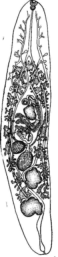 Почти круглые или слаболопастные семенники лежат в задней трети длины тела, наискось один к другому. Впереди переднего семенника располагается мощно развитый семеприемник. Почти круглый яичник лежит непосредственно впереди семеприемника и сбоку от медианной линии тела. Желточники состоят из крупных фолликулов, собранных в 7—8 групп; передняя граница желточников начинается несколько кзаду от бифуркации кишечника, а их задняя граница оканчивается на уровне заднего семенника. Половое отверстие — непосредственно впереди брюшной присоски. Матка лежит между яичником и брюшной присоской. S-образный экскреторный пузырь проходит между семенниками и между передним семенником и семеприемником.