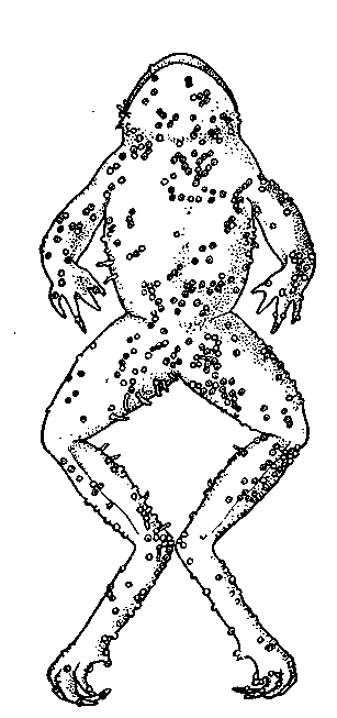 Discoglossus pictus, инвазированный метацеркариями Ratzia parva (по Брумпту, 1936)