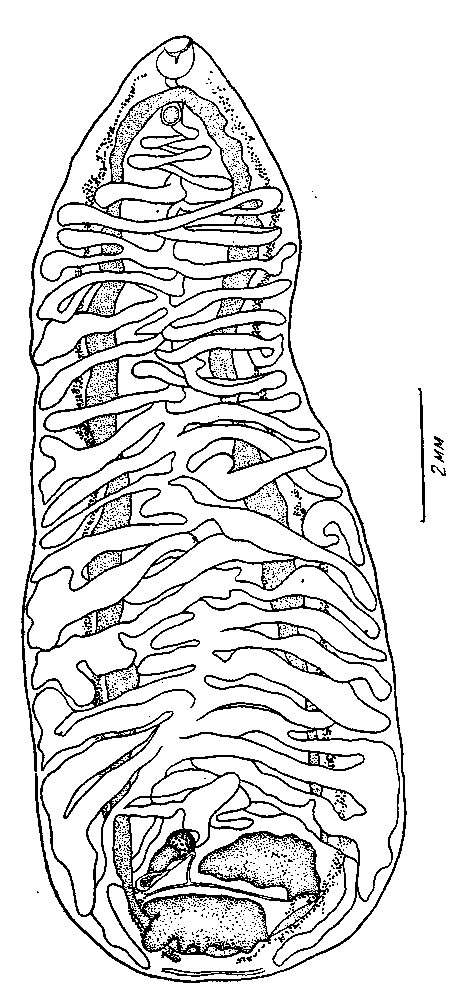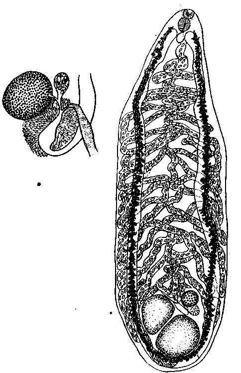 Половое отверстие лежит вентрально от заднего края глотки. Половая сумка расположена рядом у концевой части матки и слева от нее; она достигает 0.250—0.684 мм длины и 0.114— 0.0285 мм ширины и обычно доходит до внутреннего края кишечного развилка, а иногда переходит через него.