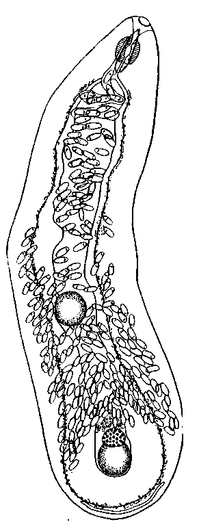 Яйца 0.18—0.20 мм длины (в обработанных препаратах), с тонкой скорлупой; можно обнаружить только в начале матки. Уже в середине тела мирацидии выходят из яиц, и видна только пустая скорлупа. Мирацидии снабжены двойным пигментным пятном и увеличиваются в размере по мере того, как они достигают полового отверстия. Вблизи кишечного разветвления они 0.31 мм длины.