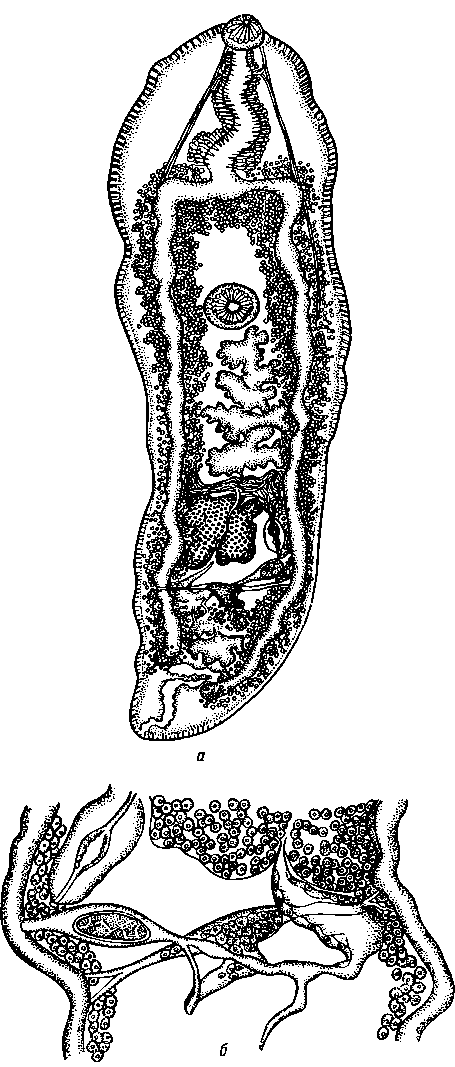 Часто в оотипе можно увидеть овальное яйцо, размером 0,054 х0,030 мм, которое вскоре выделяется через половые протоки в кровь хозяина, причем там увеличивается и созревает.