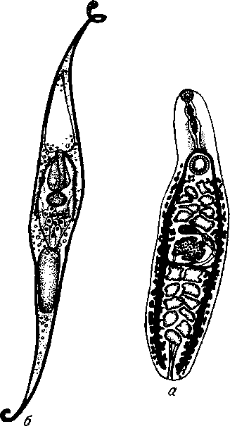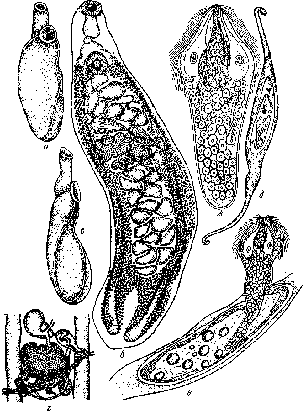 а, б и в — марита; г — нонцевые элементы половой системы; д — яйцо; е — вылупление мирацидия из яйца; ж — мирацидий