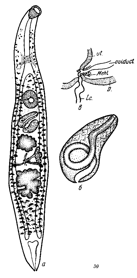a — общий вид; б — половая бурса; в — деталь полового аппарата: at. — матка; oviduct — яйцевод; Mehl — тельце Мелиса; D — желточный протон; L. с. — лауреров канал