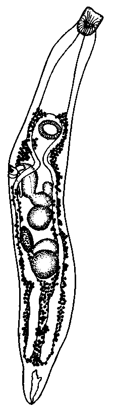 Семяприемник достигает 0,054 мм длины, при максимальной ширине 0,036 мм у своего основания. Поперечные желточные протоки и желточный резервуар располагаются непосредственно позади яичника, между ним и задним семенником. Задний семенник располагается медианно, непосредственно позади яичника и семяприемника, на расстоянии 0,454 мм от заднего конца тела; он имеет лопасти, как и передний семенник, достигает 0,096 мм длины при максимальной ширине 0,102 мм и занимает все пространство между кишечными стволами.