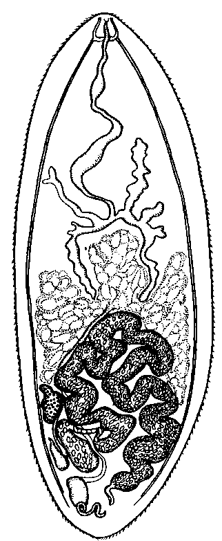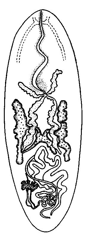 Вдоль его медианной линии виден желточный проток, а несколько впереди и близ правой стороны — маленький интенсивно окрашенный лопастной яичник. Желточники заполняют большую часть передней половины срединной области тела и располагаются вокруг кишечных ветвей, распространяясь с дорзальной стороны больше, чем с вентральной. Семенники (по Линтону) не вполне хорошо различимы, лежат вентрально и кпереди от петель матки и простираются кпереди до расщепления кишечника на передние и задние ветви. Матка хорошо заметна и заполняет большую часть задней трети тела.