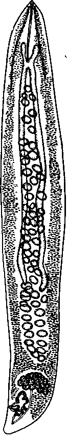 Задняя часть пищевода и переднее его вздутие окружены многочисленными, хорошо развитыми железистыми клетками. Имеется шесть кишечных дивертикулов, которые расположены несимметрично. В секреторном резервуаре, особенно у молодых паразитов, ясно видны многочисленные кровяные тельца с ядрами. Кишечные дивертикулы содержат только бесформенную желтоватую массу.