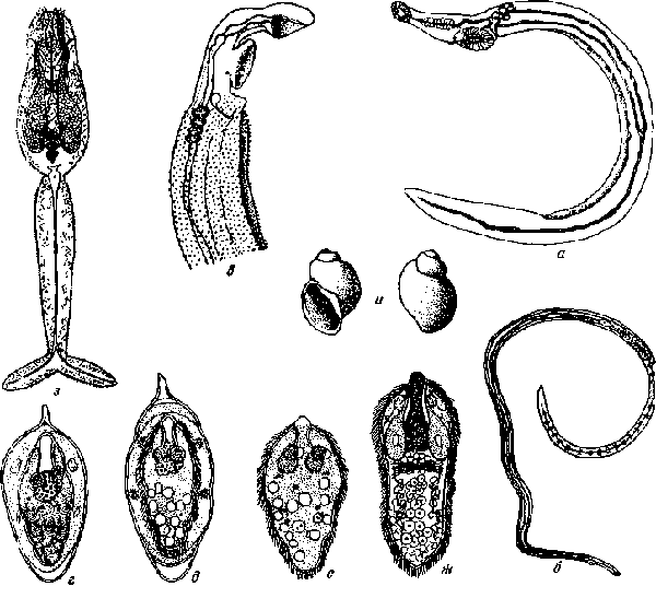 a — самец; б — самка (по Мэнсон-Бару и Фэрли, 1920); в — головной конец самца (по Прайсу, 1929); г, а, е — яйца и мирацидий (по Райэ); ж — мирацидий (по Ло-оссу); з — церкарий (по Бетанкуру и Боржу, 1922); и—моллюск Bullinus dybowshyi (по Кастеллани и Чалмзрсу)