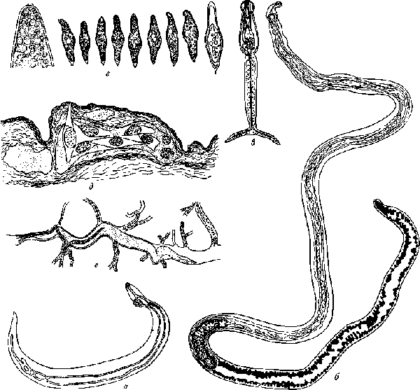 a — самец (по Калилу, 1924); б — самка; в — перкарий; г — формирование яйца; д — выхождение яиц из кровеносною сосуда в просвет кишечника; е — самец и самка в просвете сосуда; в мелких сосудах — яйца (из Брумпта, 1930)