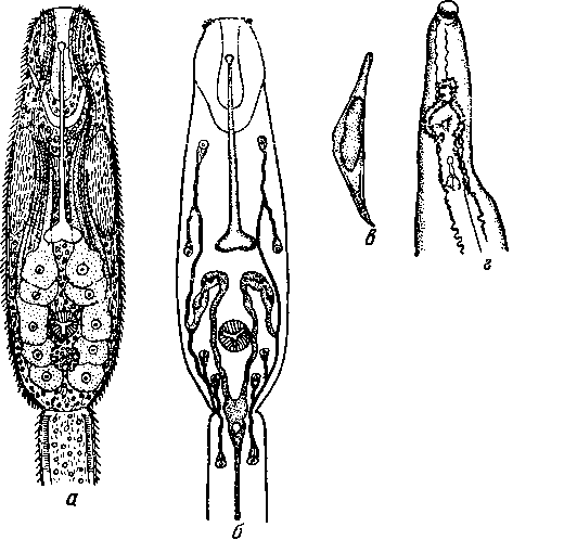 a, 6 — строение церкария (по Сопаркару, 1921); в — яйцо (по Монтгомери, 1906); г — головной конец самки