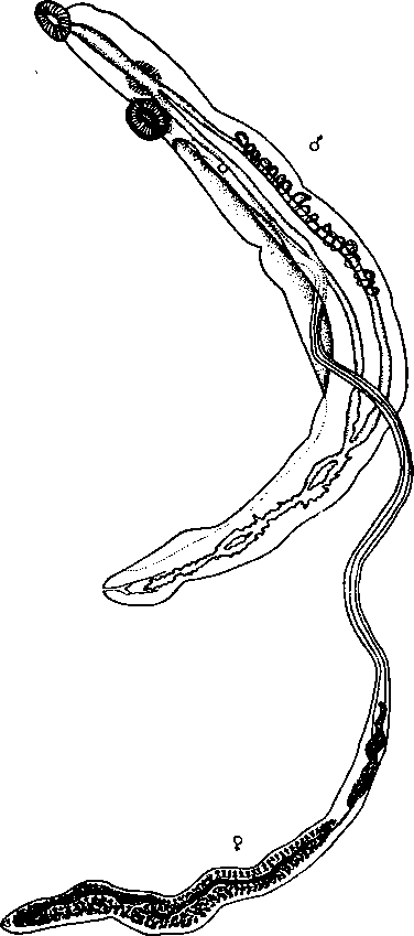 Они начинаются на расстоянии 0,2 мм позади полового отверстия и достигают середины длины тела. Половая бурса хорошо развита, содержит семенной пузырек и простатические железы. Половое отверстие лежит на расстоянии 0,125 мм кзади от брюшной присоски, несколько влево от медианной линии. Экскреторная система состоит из Y-образного пузыря, открывающегося на заднем конце тела. С передними частями его ветвей соединены очень нежные трубки, снабженные внутри ресничками. Самка 4,5—5,0 мм длины. Передний отдел тела тонкий, 2,65 мм длины при ширине 0,136 мм. Ротовая присоска отсутствует. Стебельчатая брюшная присоска достигает в диаметре 0,035 мм.