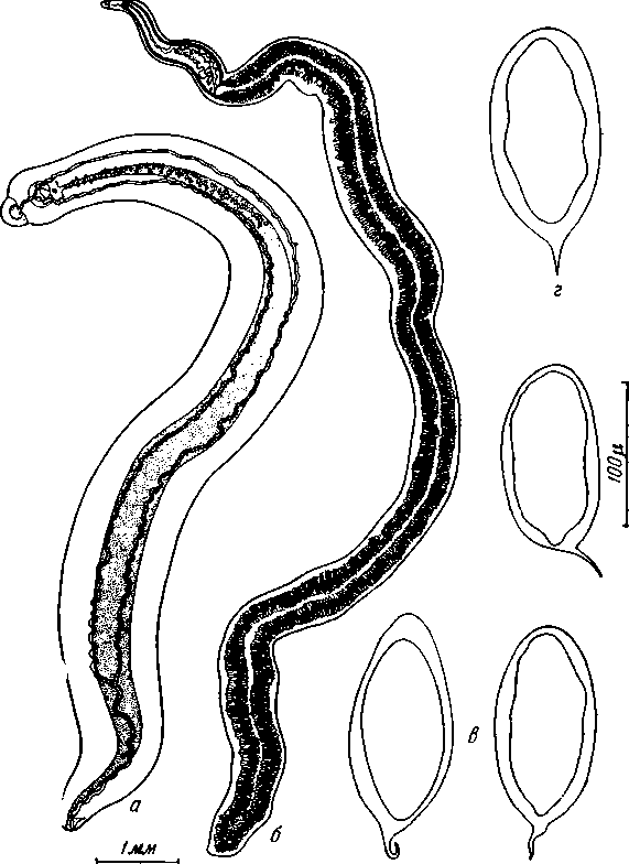 a — самец; б — самка; в, г — форма яиц