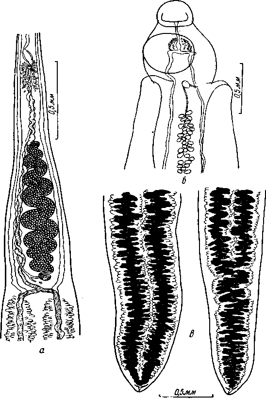 a — участок тела с половыми железами; б — головной конец; в — хвостовые концы