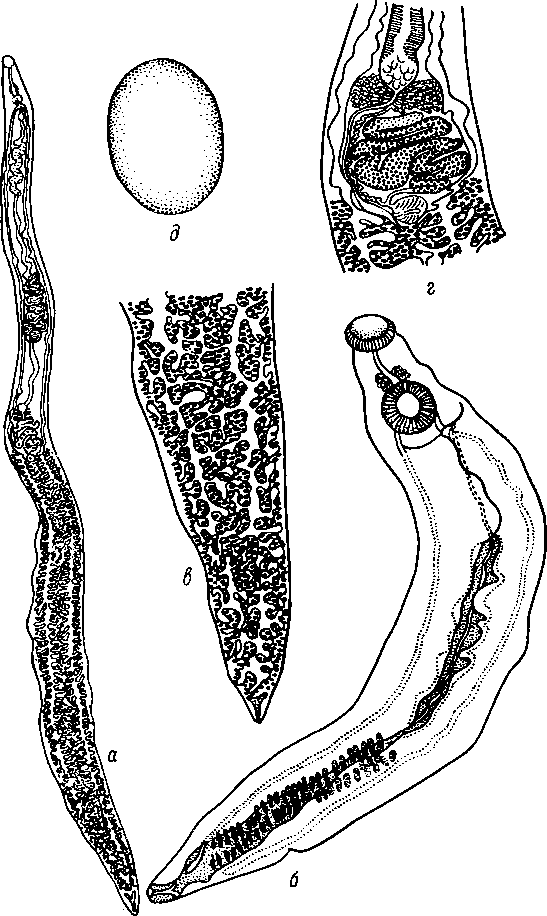 a — самка; 6 — самец; в, г — детали строения; д — яйцо