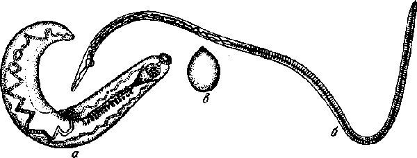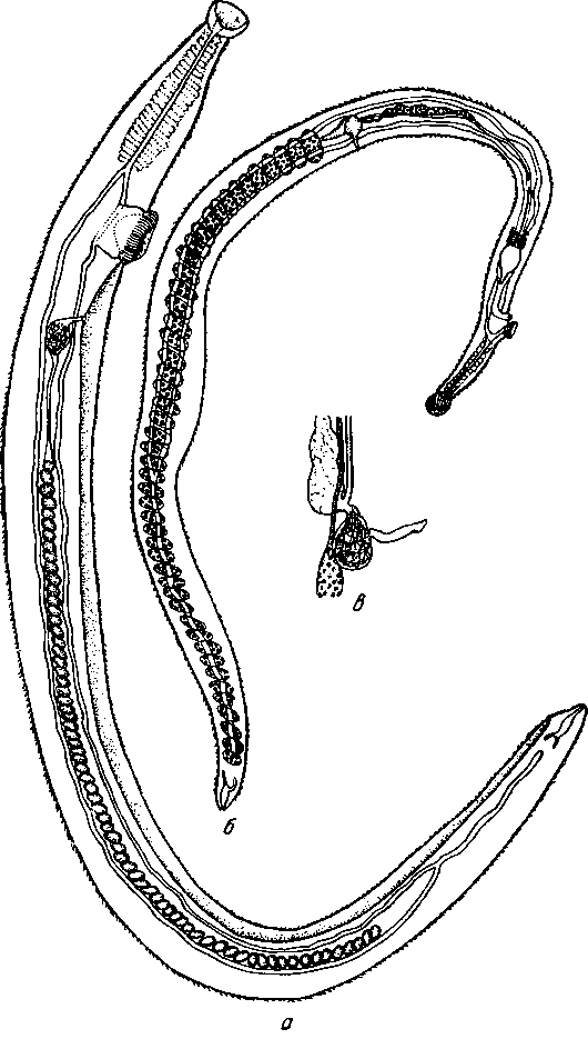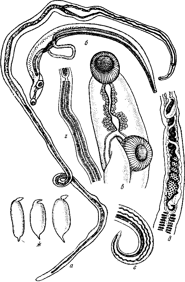 а — самка; б — самец с самкой; в — головной конец; г — участок тела самки с желточниками; д — половой аппарат самки; е — хвостовой конец самки; ж — яйца