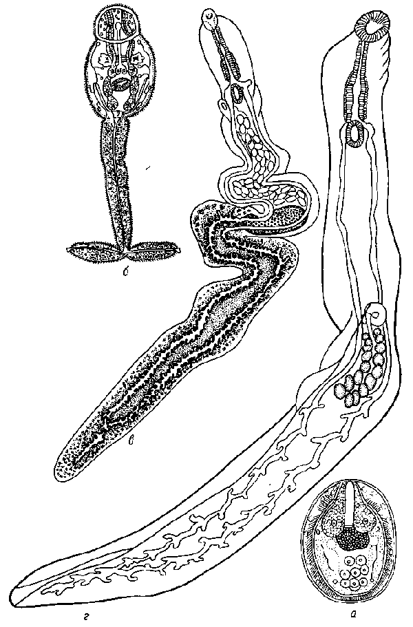 a — яйцо с мирацидием; б — церкарий; в — самка; г — самец
