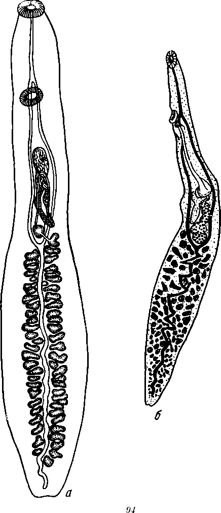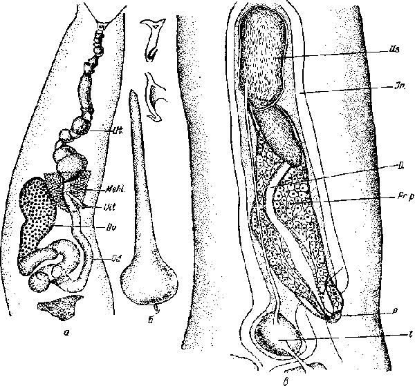 a — половая система самки; б — яйцо; в — половая система самца; Ut.— матка; Mehl.— тельце Мелиса; Vit.—желточник; Ov. — яичник; Od.— яйцевод; Vs. — семенной пузырек; In.—кишечник; D.— семяизвергательный канал; Pr. p.—простатическая часть; P. — отверстие; t. — семенник