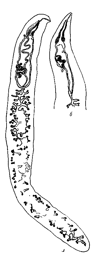 Циррус хорошо развит; дистальный его конец имеет бульбусовидную форму. Самка. Тело уплощенное, удлиненное, достигает 8,0 мм длины при ширине 0,89—1,01 мм. Присоски отсутствуют. Ротовое отверстие располагается субтерминально; пищевод 0,621 мм длины; кишечные стволы сое,дгшятотся в непарный отдел на расстоянии 1,55 мм от бифуркации; общий непарный ствол кишечника снабжен латеральными ветвящимися отростками и направляется к заднему концу тела, образуя зигзаги.