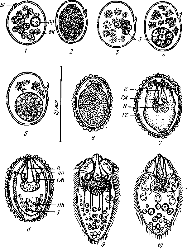 1 — оплодотворенное яйцо, только что отложенное самкой; 2 — неоплодотворенное яйцо из фекалий собаки; 3, 4, 5, 6— последовательные стадии развития зародыша; 7, 8 — развивающийся мирацидий; 9 — зрелый мирацидий, вышедший из яйца; 10 — постинвазионный мирацидий. ГЖ — головная железа; ЖК — желточные клетки; ЛП — протоки латеральных желез; Я — кишечник; Я — нервный узел; 00 — ооцпт; ПК — пламеневидные клетки; СС — слизистый секрет; Ш —шип; 3 — зародышевые клетки