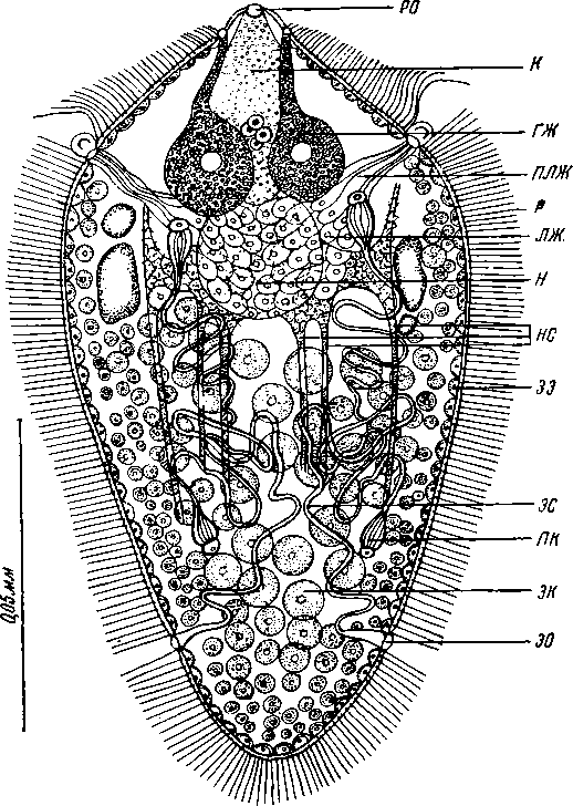 ГЖ — головные железы; ЗН — зародышевые клетки; ЗЭ — зародышевый эпителий; К —кишечник; ЛЖ — латеральные железы; ПЛЖ — протоки латеральных желез; Н — нервный узел; НС — нервные стволы; ПН — пламеневидные клетки; Р — реснички; РО — ротовое отверстие; ЭО — экскреторное отверстие; ЭС — экскреторные сосуды
