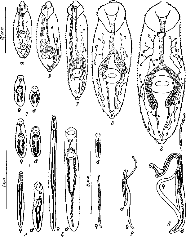 альфа-стадия; бета-стадия; гамма-стадия; дельта-стадия; эпсилон-стадия; тета-стадия; иота стадия; ми-стадия; кси-стадия; пи-стадия; ро-стадия; А — половозрелые шпстозомы