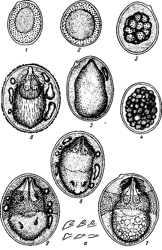 1, 2 — последовательные стадии развития яиц из фекалии собаки; 3, 4 то же — человека; о — не совсем зрелое яйцо из человеческих фекалии; 6, 7 - зрелые яйца с живыми мирацидиями из фекалий человека; 8, 9 то же — собаки; а — шины и бугорки от яиц шистозом, обнаруженные в фекалиях человека и собаки