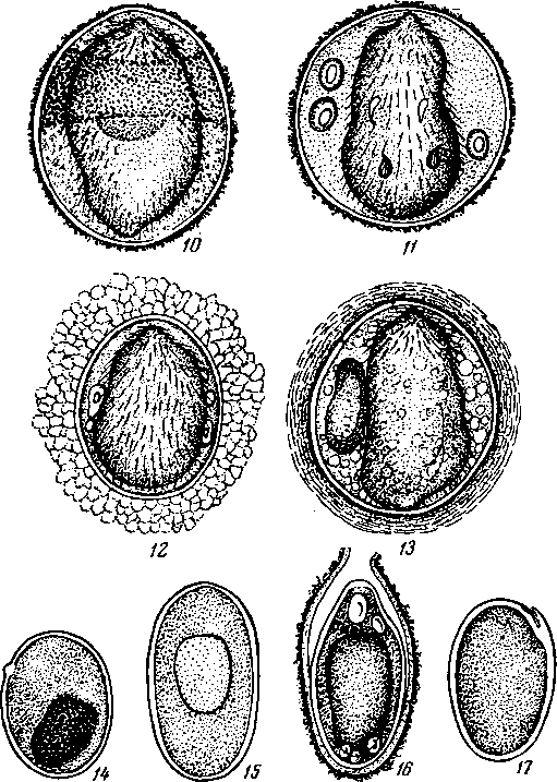 10, 11 — зрелые яйца с живыми мирацидиями из фекалий человека; 12 - яйцо из псевдоабсцесса; 13 — яйцо из псевдотуберкула; 14, 15, 17 — дегенерировавшие яйца, еще не начавшие развития; 16 — мертвое, наполовину созревшее яйцо на 13-й день после лечения фуадином