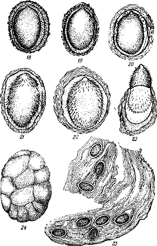 18, 19, 20 — мертвые, наполовину созревшие яйца на 13-й день после лечения фуадином; 21, 22, 23 - мертвые яйца на 13-день после лечения фуадином; 24 — зрелое, полностью обызвествленное яйцо (увеличено в 500 раз); 25 — комочки слизи из кишечника человека с яйцами шистозомы