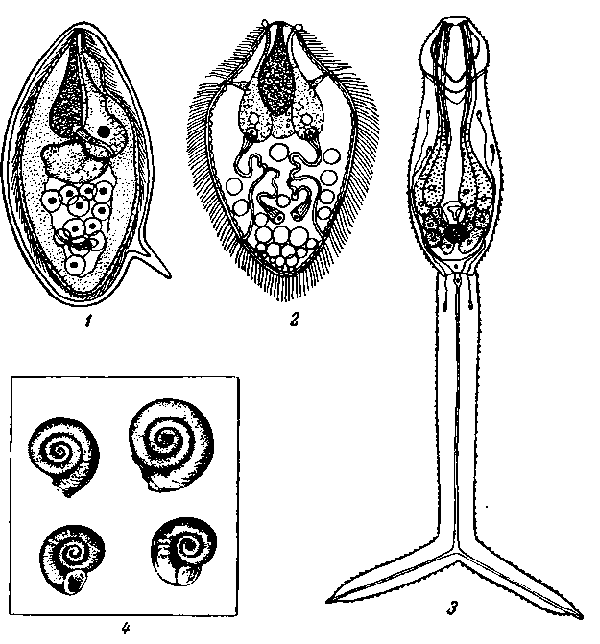 1 — яйцо (виден латеральный шип) (увеличено в 370 раз); 2 — мирацидий (увеличен в 400 раз); 3— церкарий (увеличен в 340 раз); 4 — моллюски — промежуточные хозяева в натуральную величину: слева — Planorbis boissyi из Египта, справа — Pl. guadeloupensis — из Венесуэлы